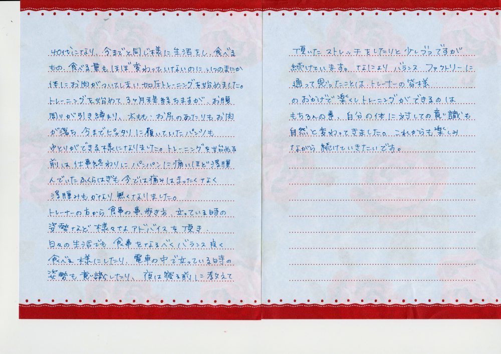 今年の3月から加圧トレーニングを始められたSさんにこの3ヶ月のご感想をうかがったところ、嬉しいことにお手紙にしたためて下さったので、ご本人の許可を得てご紹介させていただきます。