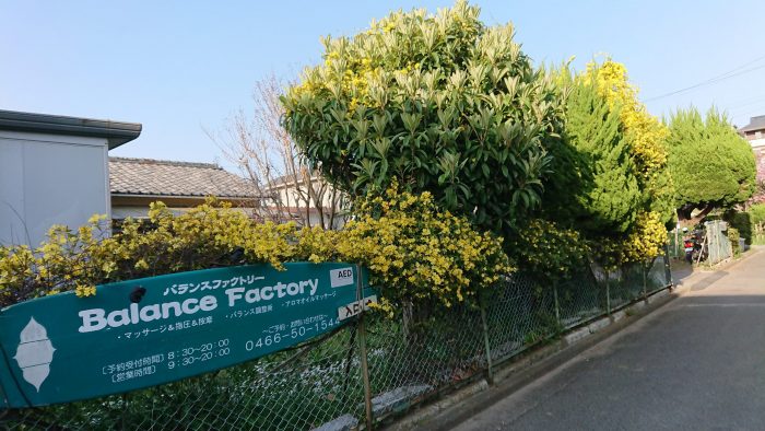 バランスファクトリーの庭にはジャスミンの黄色い花が咲き誇り、50mほど先の八重桜もほぼ満開になってきました。