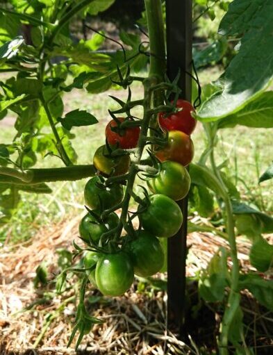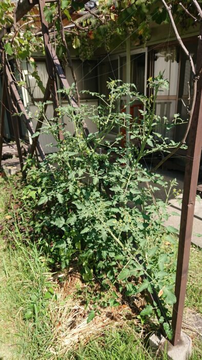 ついでに我が家の庭に去年の落ち種から勝手に出てきたミニトマトの苗をブドウの脇に植えてみたところ、お客様も驚くほどの太さと勢いで大きくなって、ミニ中玉ぐらいの立派な赤い実をつけてくれています。